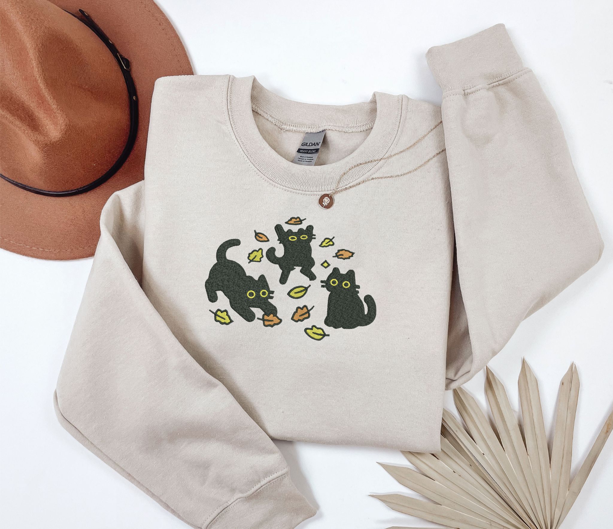 ๐ Autumn leaves with playful black cats super cute embroidered sweatshirt