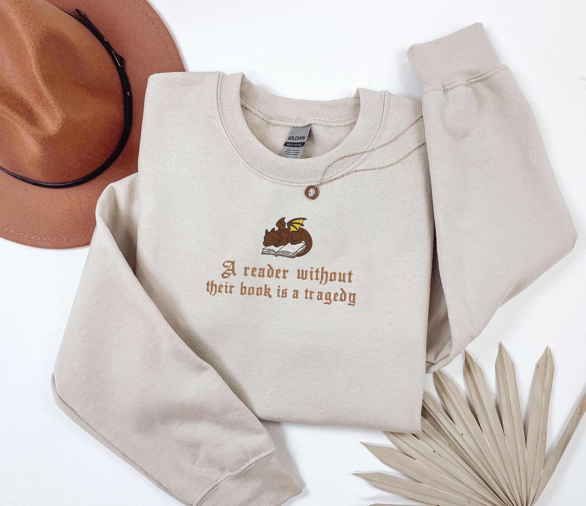 Embroidered a reader without their kindle is a tragedy book dragon sweatshirt.