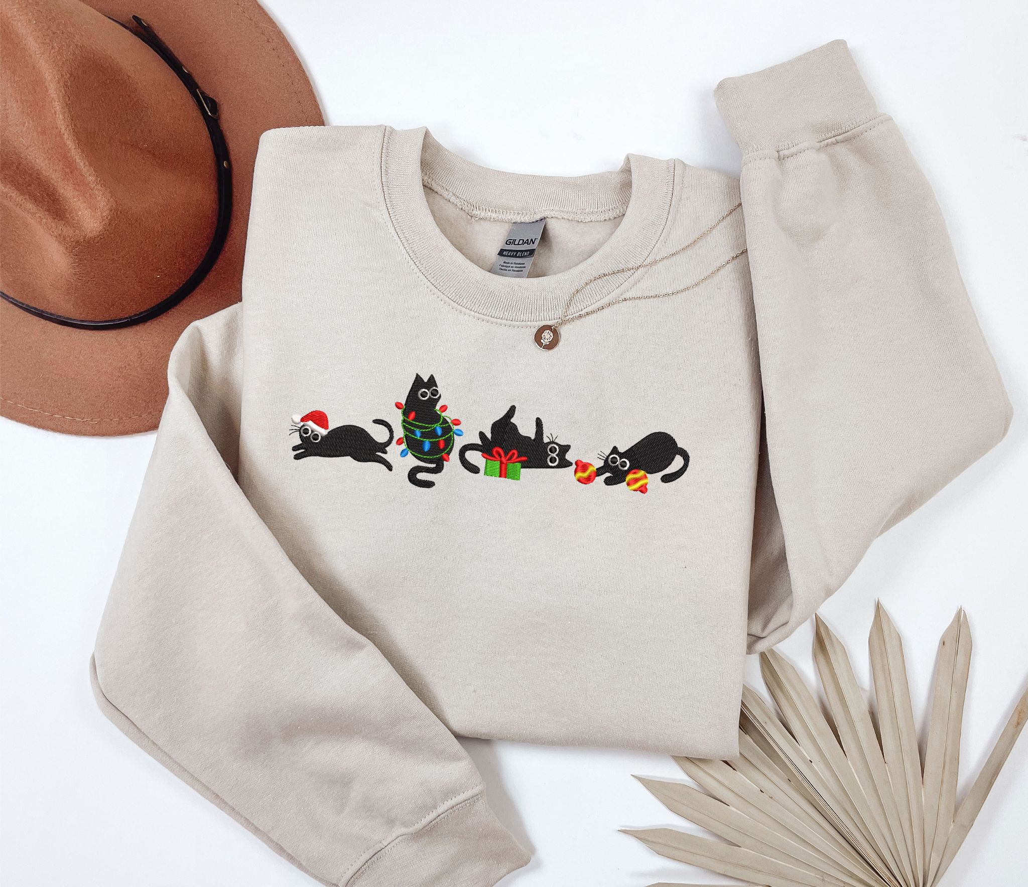 Embroidered Christmas Cat Sweatshirt: Playful Holiday Jumper