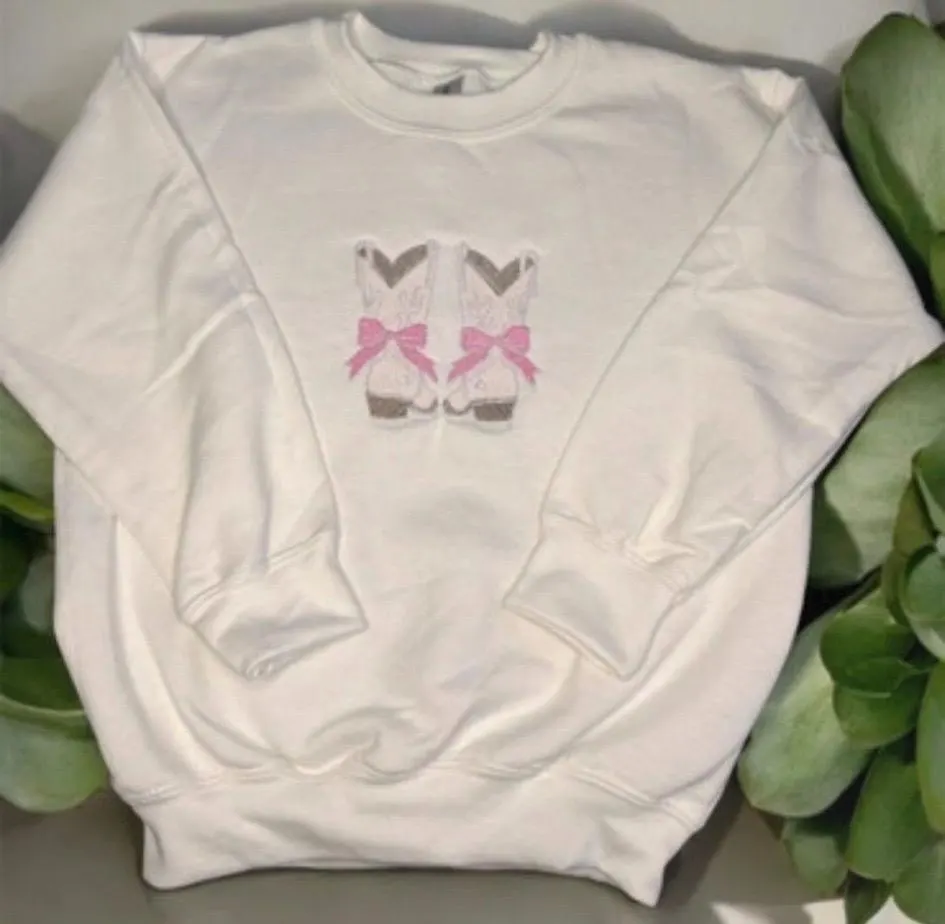 Gorgeous cowboy boots with a pretty pink bow embroidered childrens, sweatshirt or hoodie.