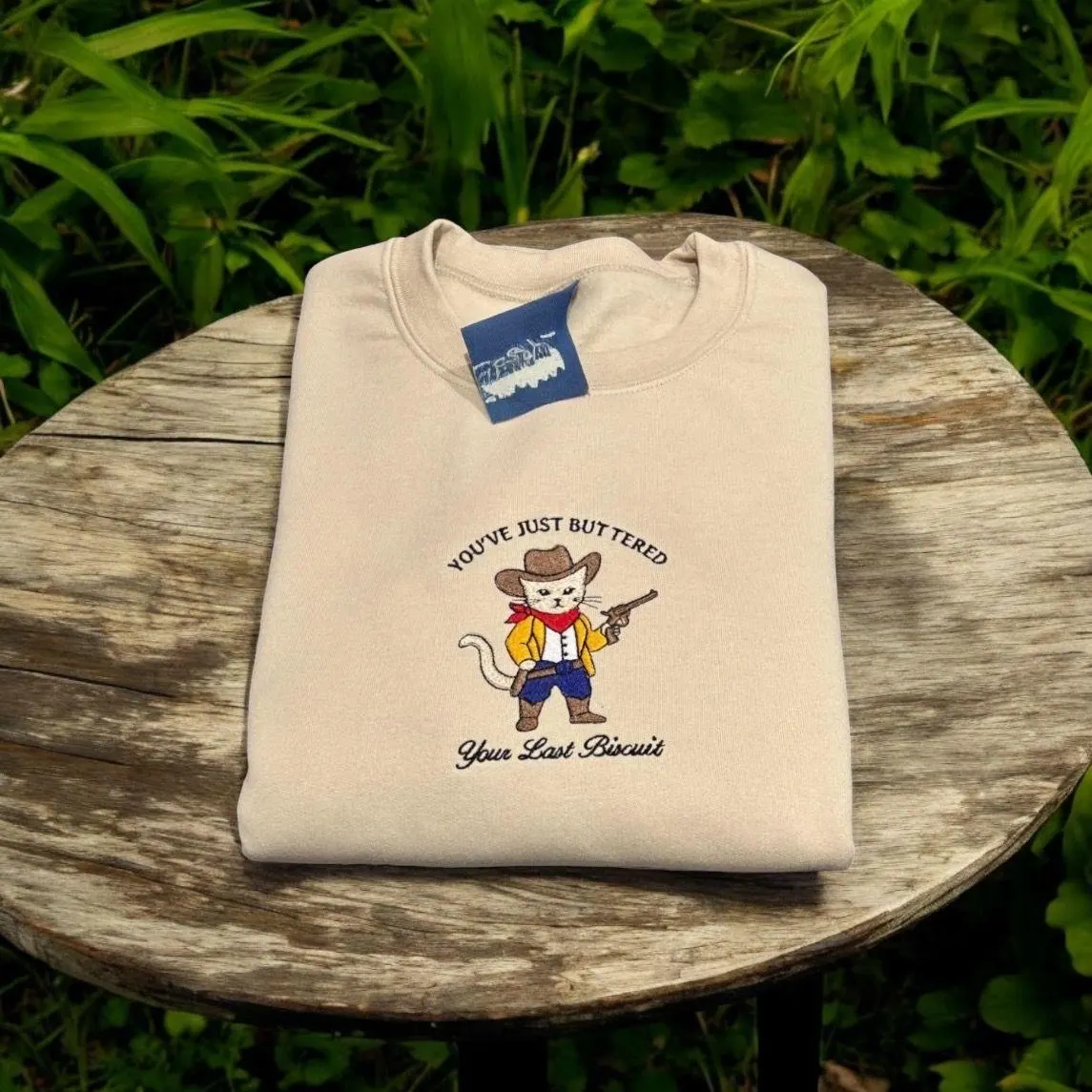 Embroidered cat in cowboy hat and boots just buttered your last biscuit, sweatshirt or hoodie. Country clothing, cowgirl, animal clothes.