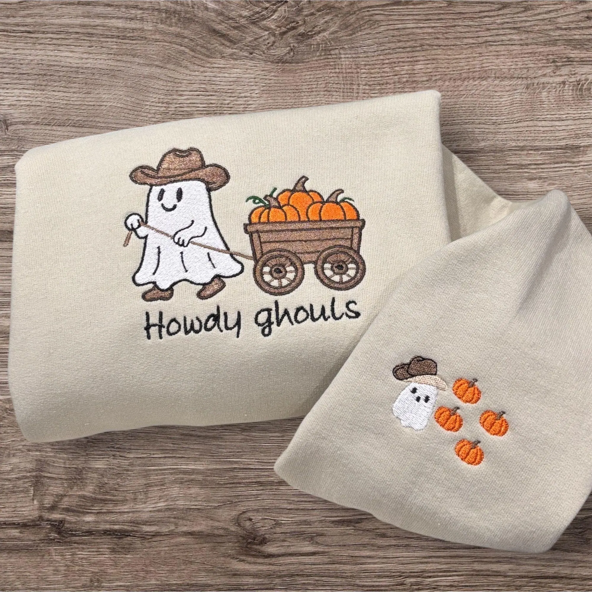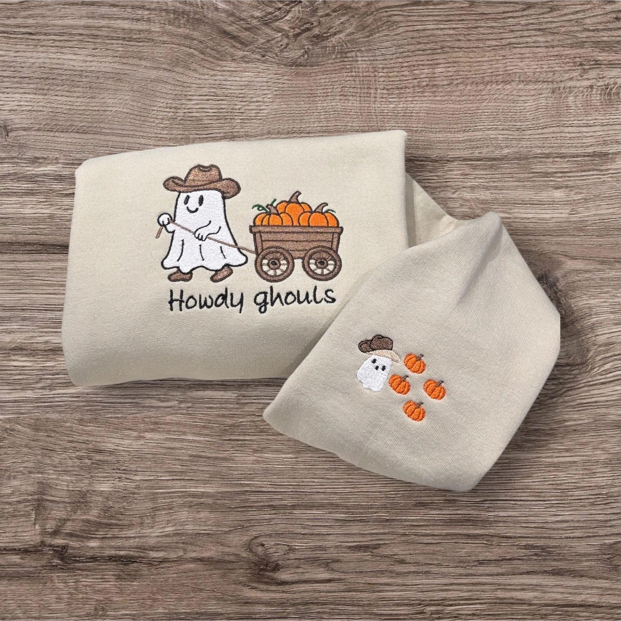 🤠 Embroidered cute cowboy ghost wearing a cowboy hat and cowboy boots, pulling a wooden cart of pumpkins featuring the slogan howdy ghouls sweatshirt or hoodie. Western Halloween clothing.