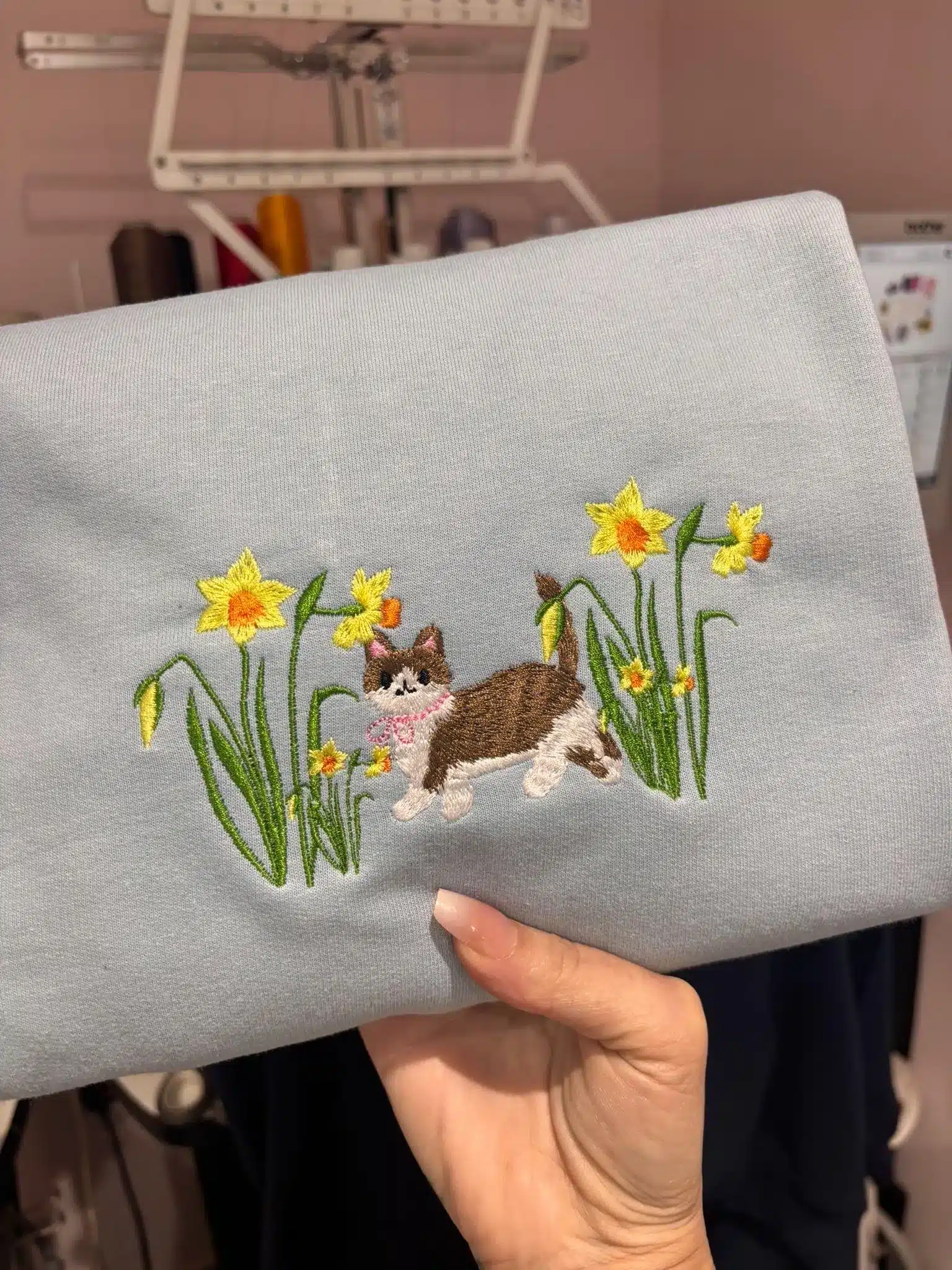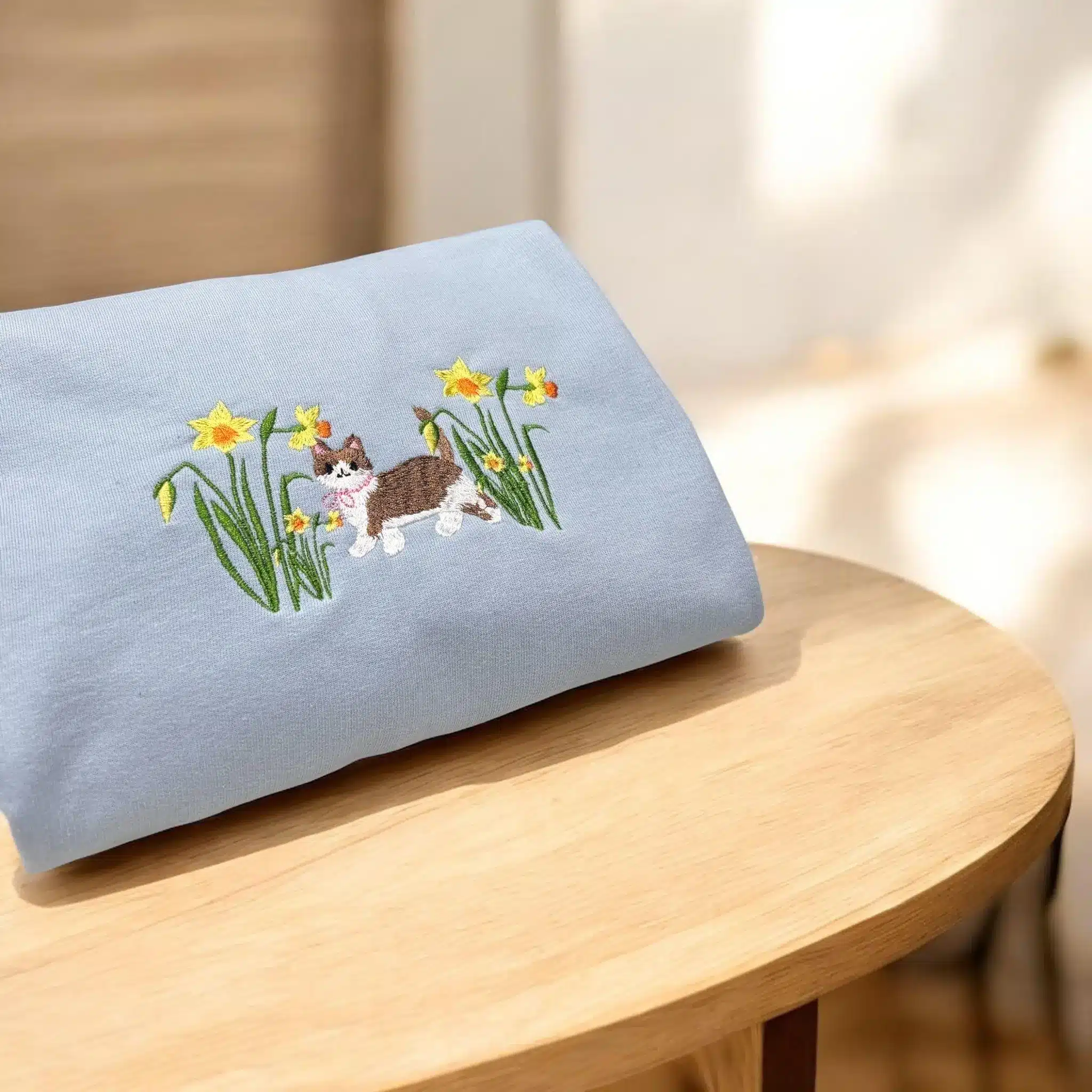 Embroidered cat in daffodil flowers sweatshirt.