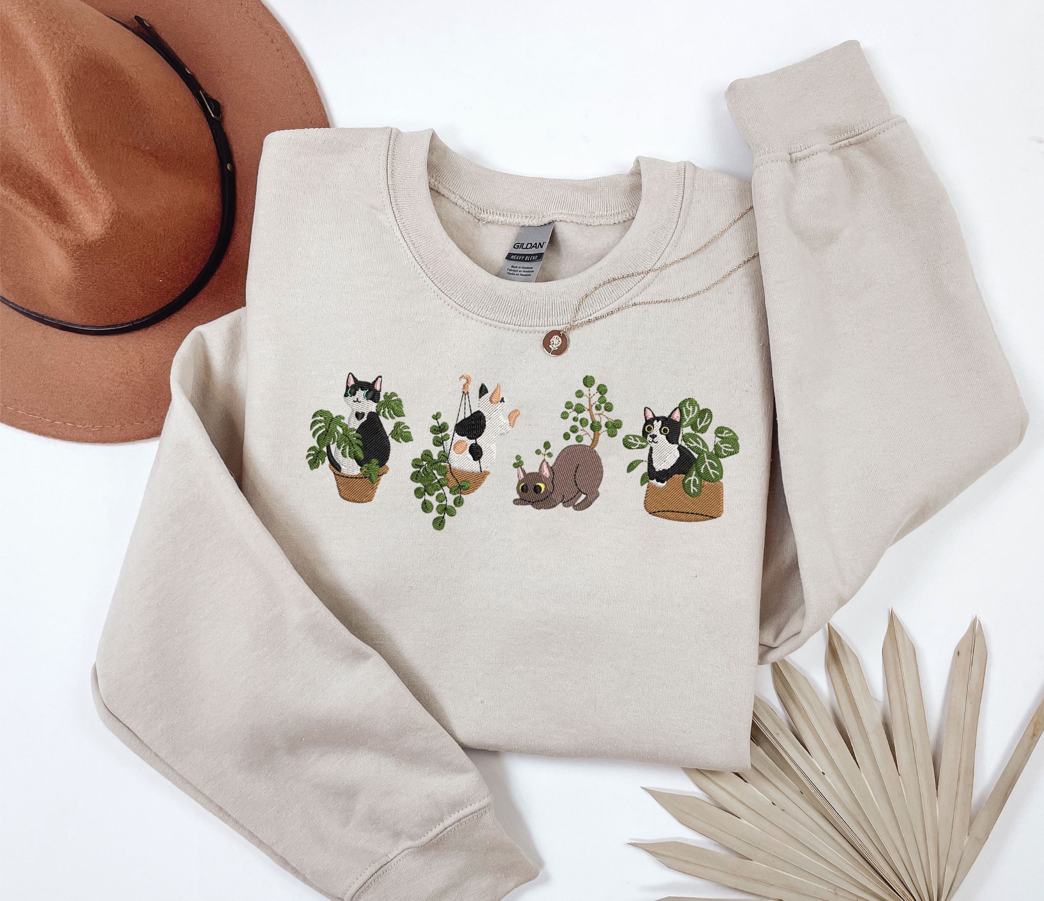 Embroidered cute cats in plants sweatshirt or hoodie.