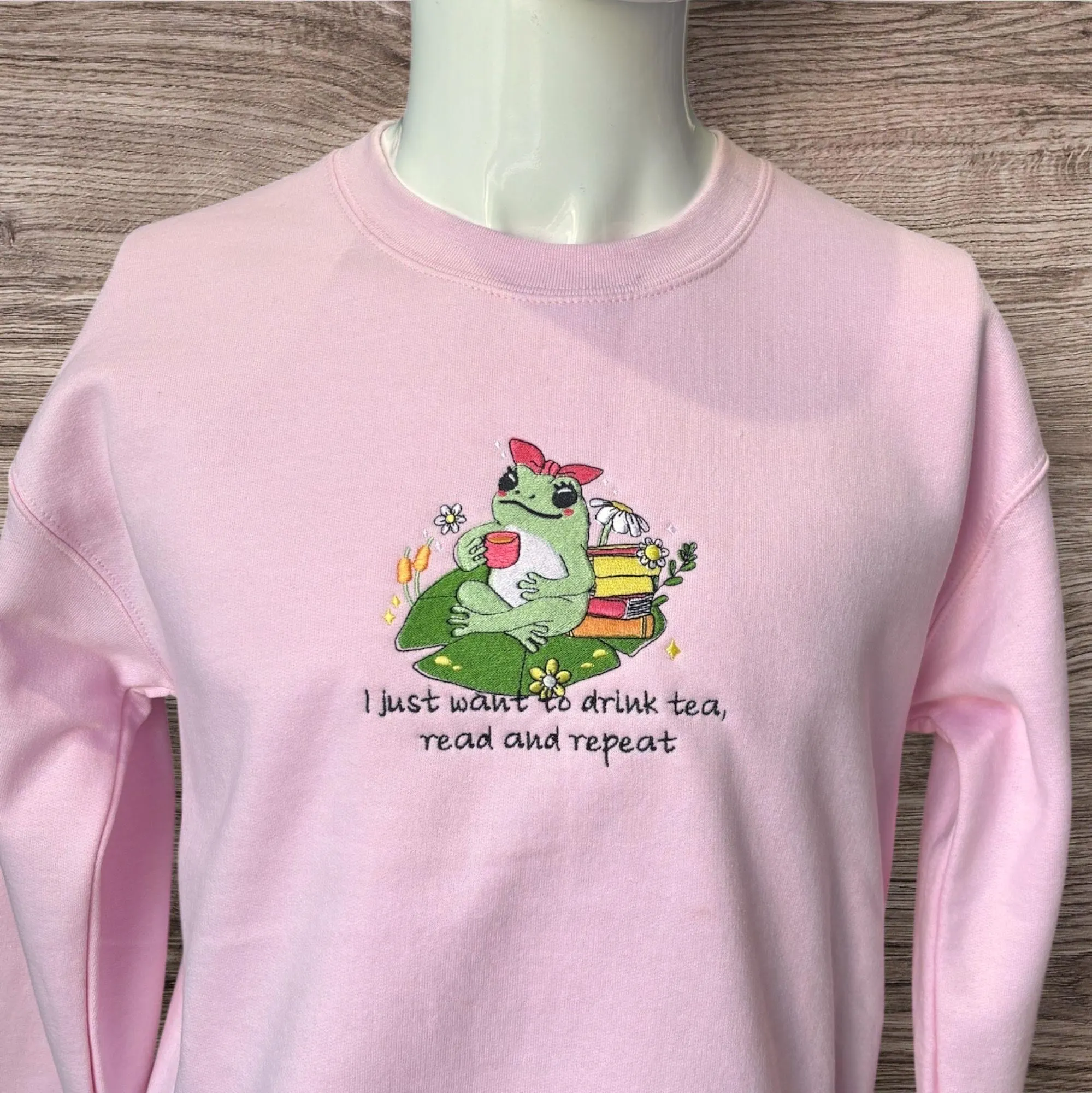 🐸 This cute and comical embroidered frog sat on a lily pad with a stack of books and a cuppa coffee with the slogan “ I just want to drink tea, read and repeat” is available in sweatshirts or hoodies.