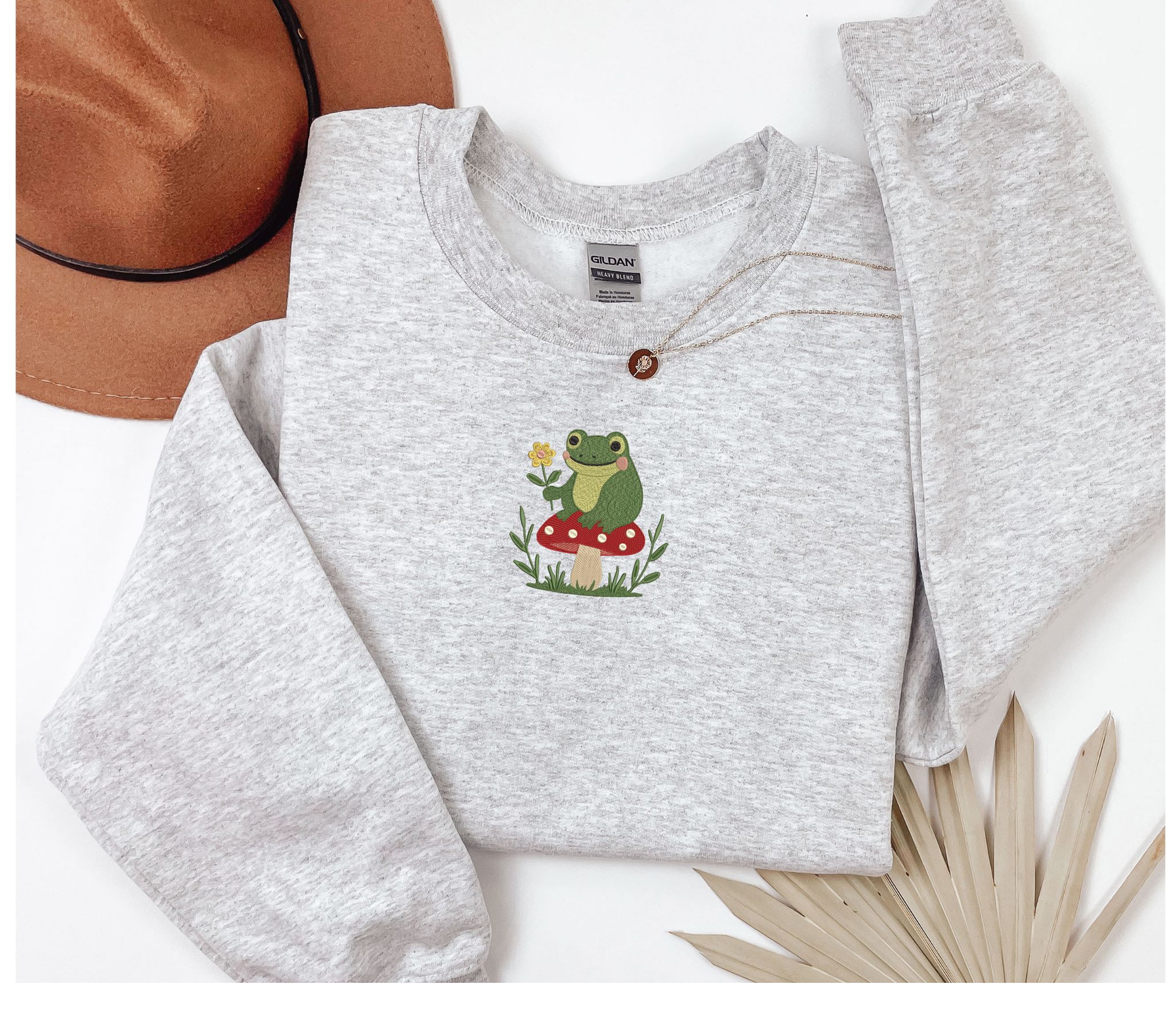 Super cute frog sat on a toadstool embroidered sweatshirt.