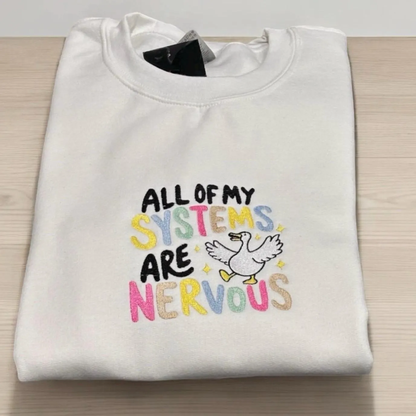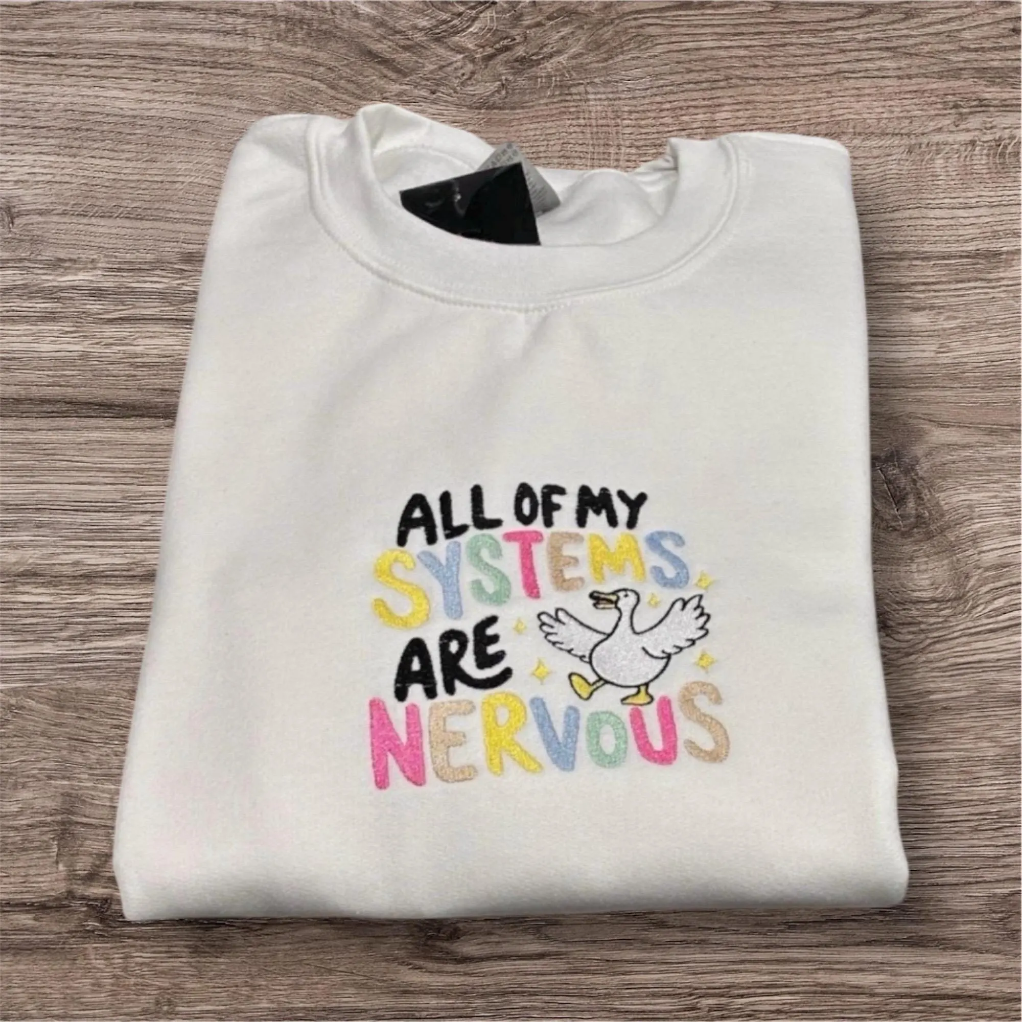 Embroidered all systems are nervous sweatshirt, funny hoodie, mental health clothing, gift, crew neck jumper, goose, animal.
