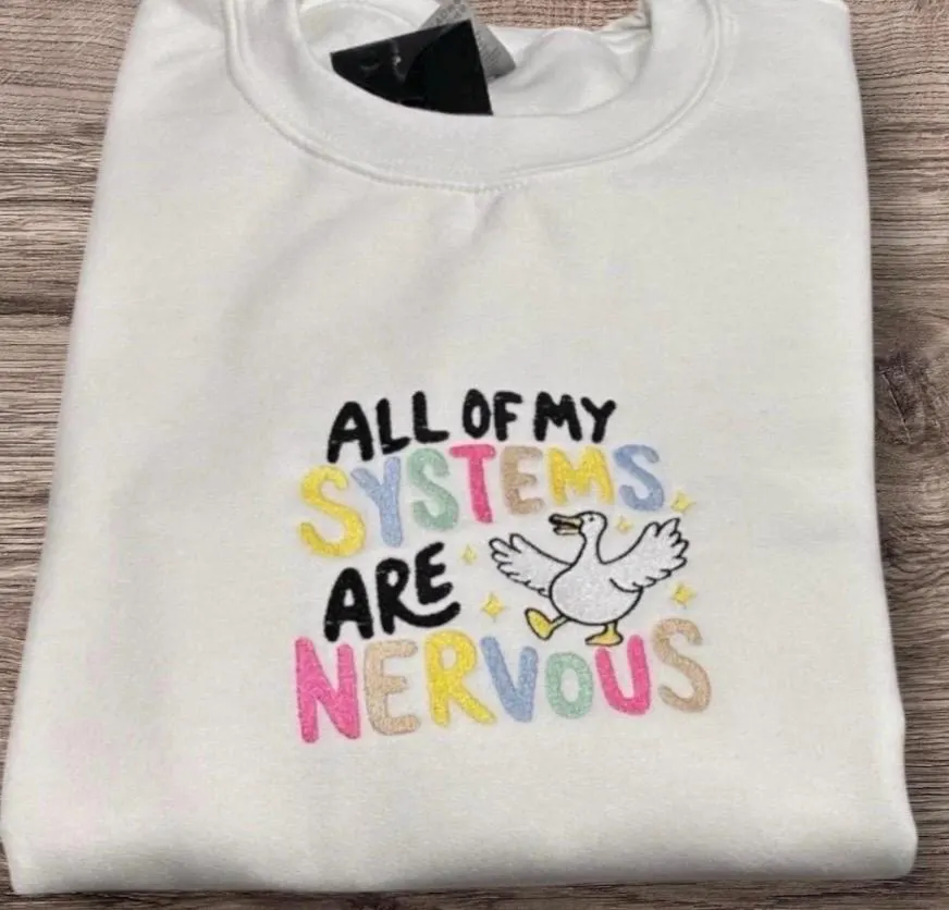 🪿 This cute and comical embroidered goose with the colourful slogan statement “All of my systems are nervous” available in the garments, sweatshirt or hoodie is the perfect fashion staple for your wardrobe that adds a touch of humour, mental health awareness and animal vibes.
