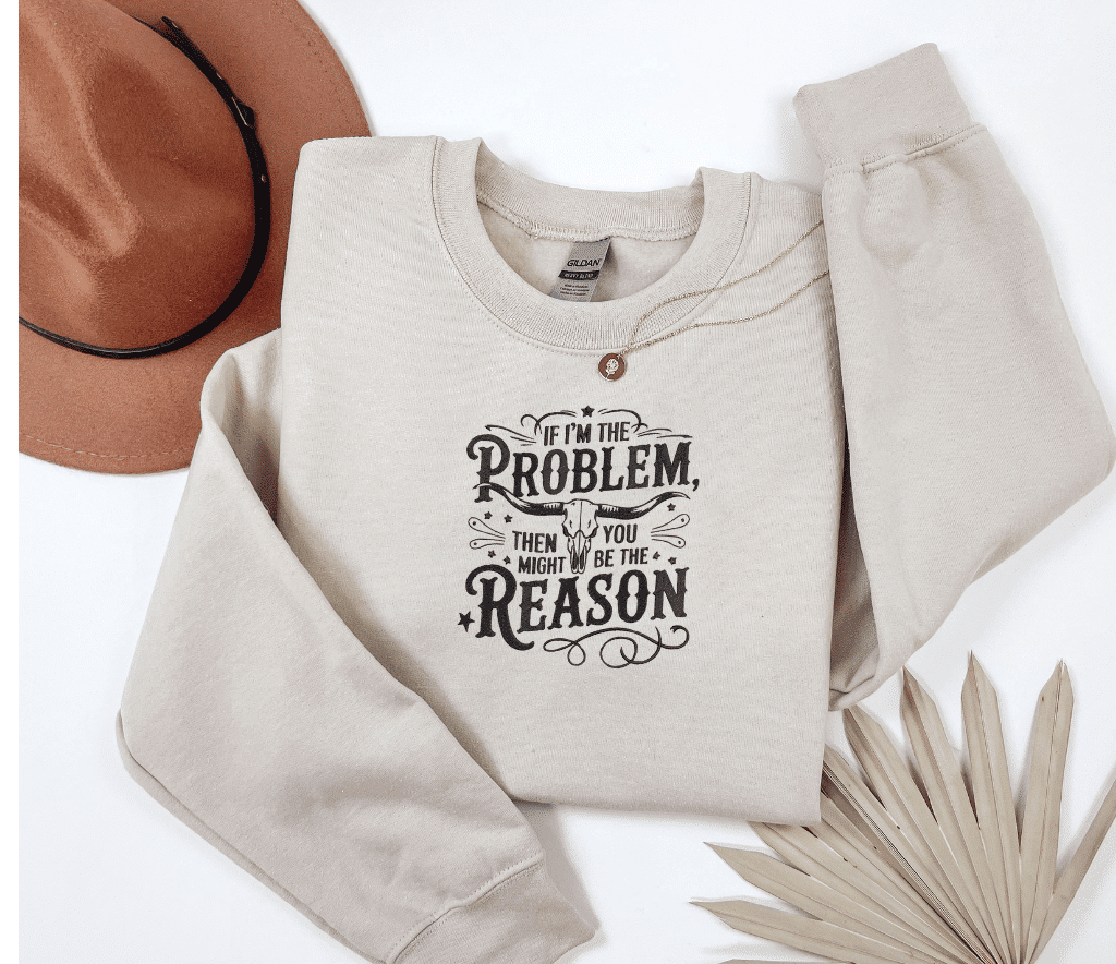 Embroidered longhorn, featuring the slogan “if I’m the problem then you might be the reason” sweatshirt or hoodie.