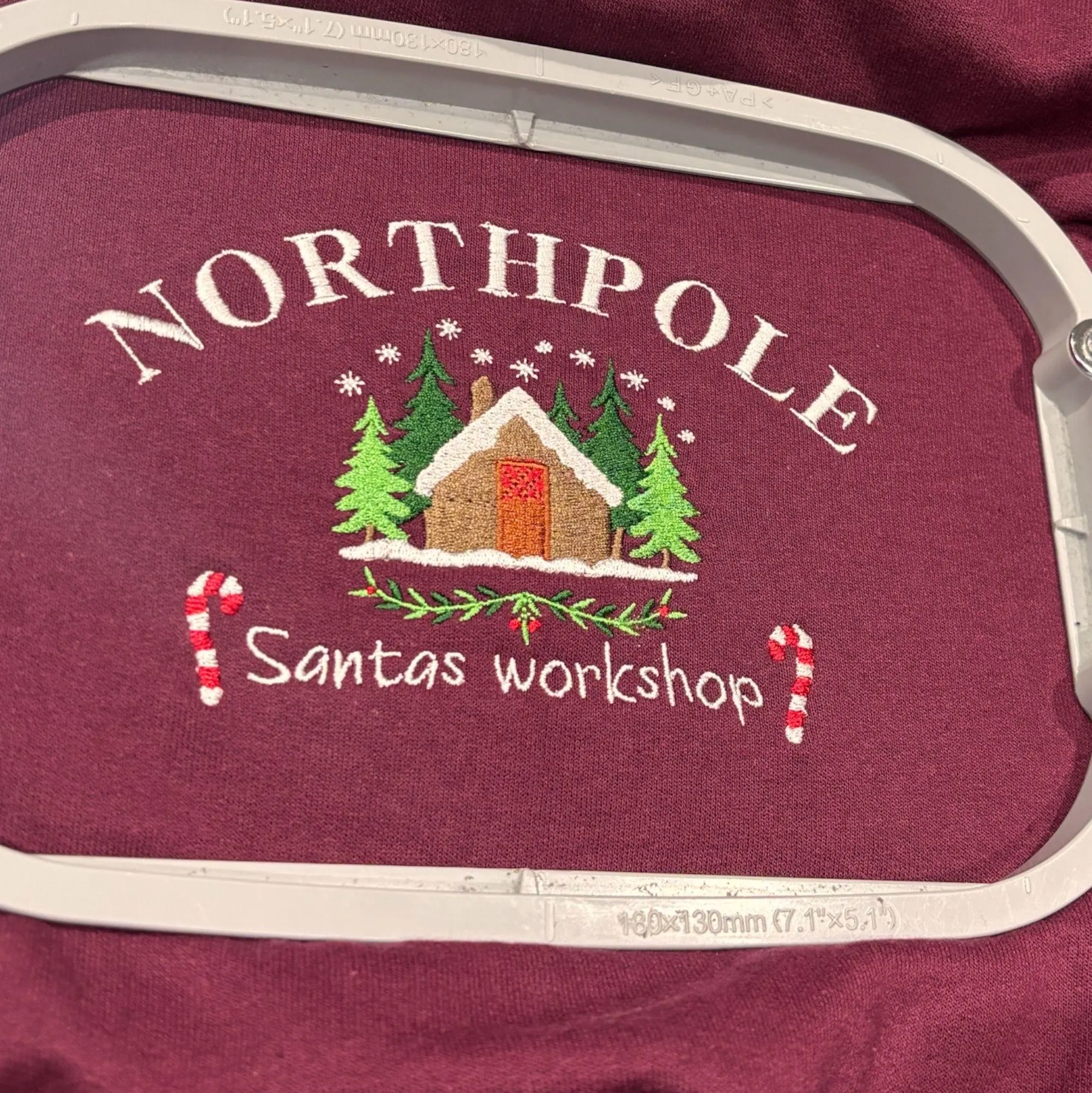 🎅 Embroidered Northpole santas work shop sweatshirt, featuring a super cute snowy festive log cabin with Christmas trees.